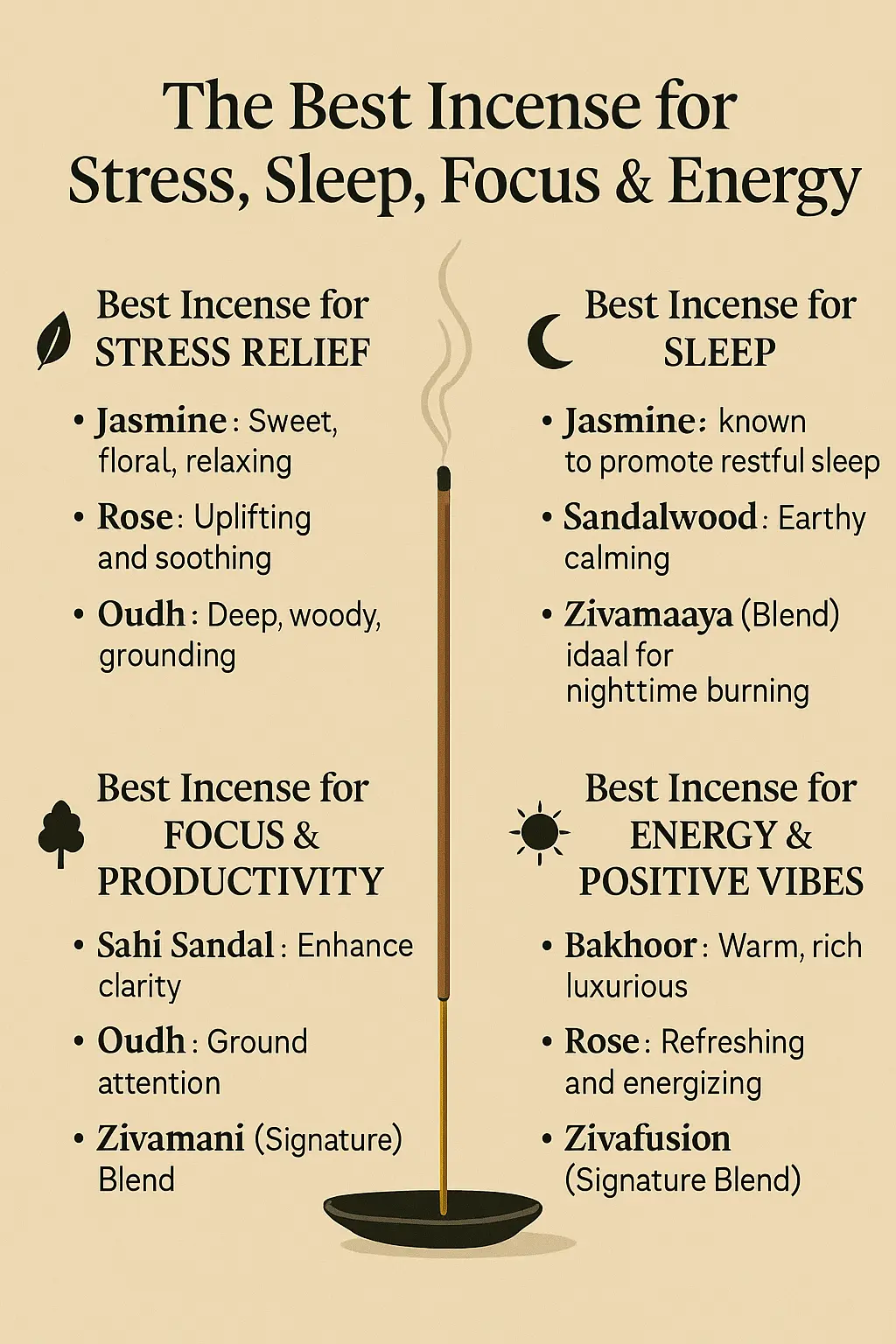 At Zivanta, we create charcoal-free, natural incense designed to support your daily wellness goals. Here’s a complete guide to choosing the perfect fragrance for your needs.